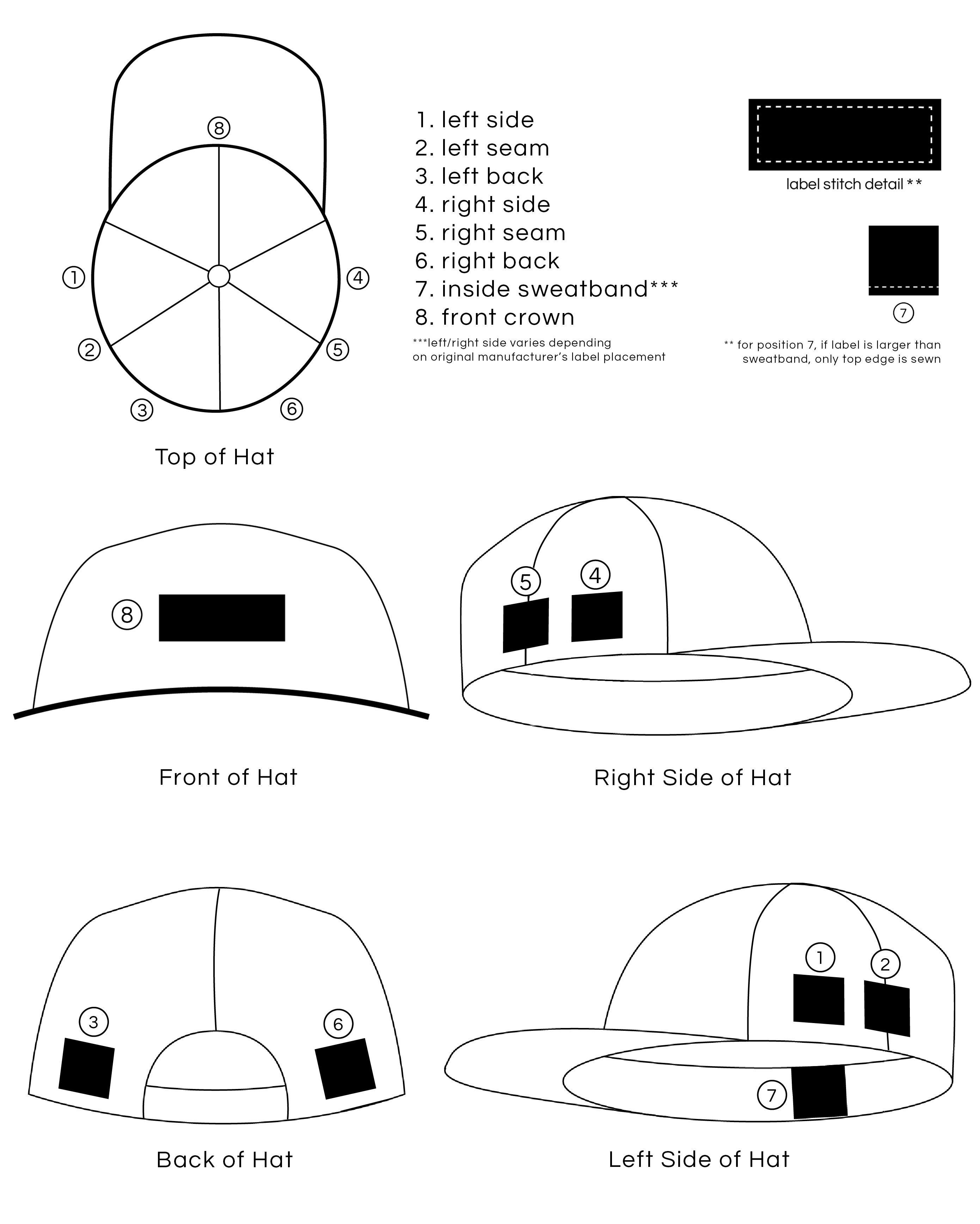 | Inside Sweatband | Centered between the top and bottom of the sweatband. *For labels which exceed the height of the sweatband, the label will only be sewn at the top edge of the label aligned with the top of the sweatband. Recommend label height of 1" or smaller for this position for sewing along all 4 edges of the label | For 6 panel hats, sewn centered on the side panel seam. For 5 panel hats, centered in the side panel. This may be on the right or left depending on the type of hat and placement of the original manufacturer's label placements |