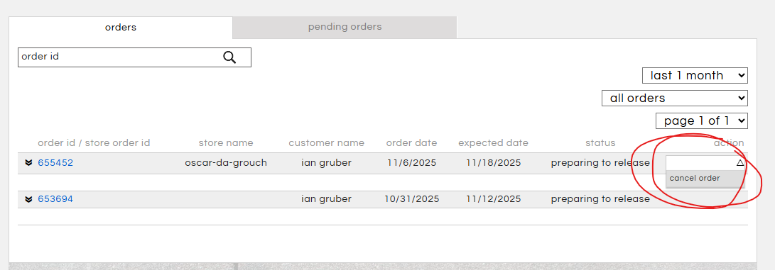 - Click the drop down on the order and select "cancel order." If not cancel option is available, the order has been started and it's too late to cancel.