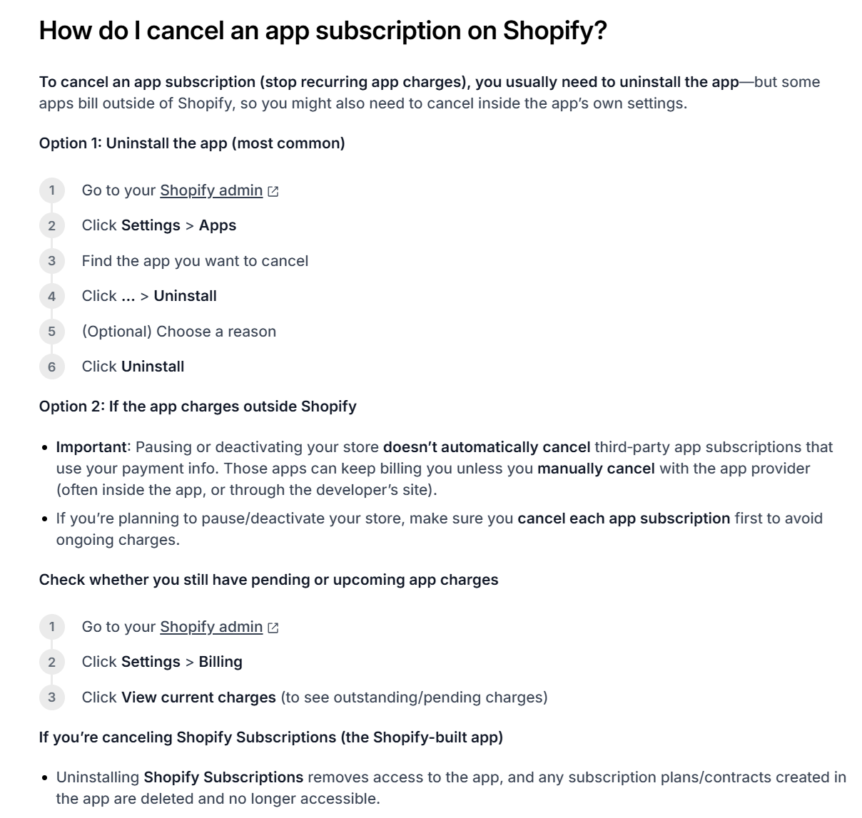 And when that is the case, per Shopify's own support and documentation, the only way to cancel an app's subscription is to fully uninstall the app associated with the monthly charge, Option 1 in the screenshot below: