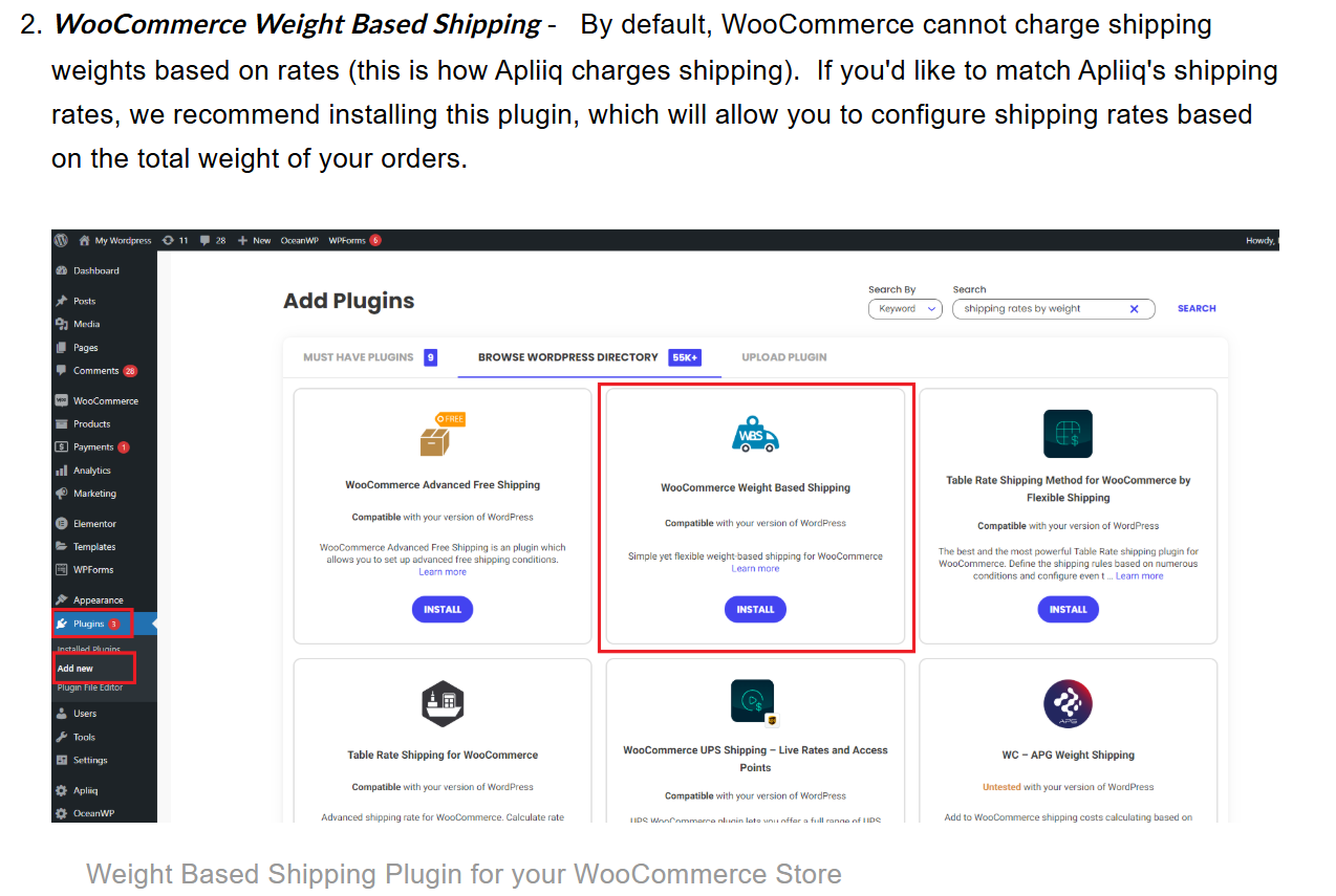 Secondly, the Apliiq Woocommerce integrated app isn't able to create any app shipping profiles when integrating the app with your Apliiq account. auto-installed during integratione recommend you download, install and then Build Out the Weight-Based Shipping plugin: