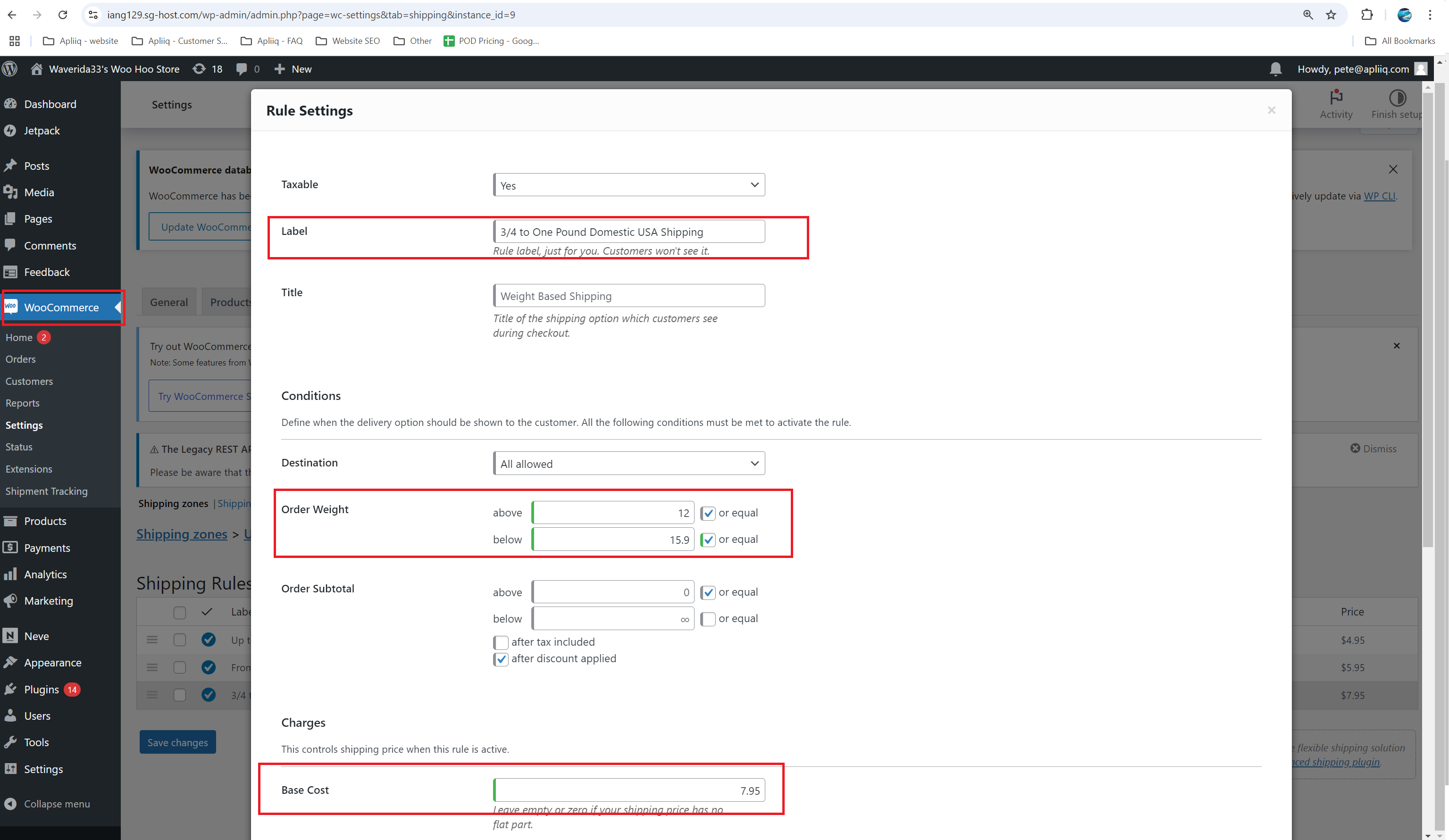 There are different shipping rates for different countries and there are also different shipping rate weight tiers for each country. However, there is no inherent way in your Woocommerce store to charge your customers for shipping as Apliiq charges you for shipping. This is where the Weight-Based Shipping plugin comes in.