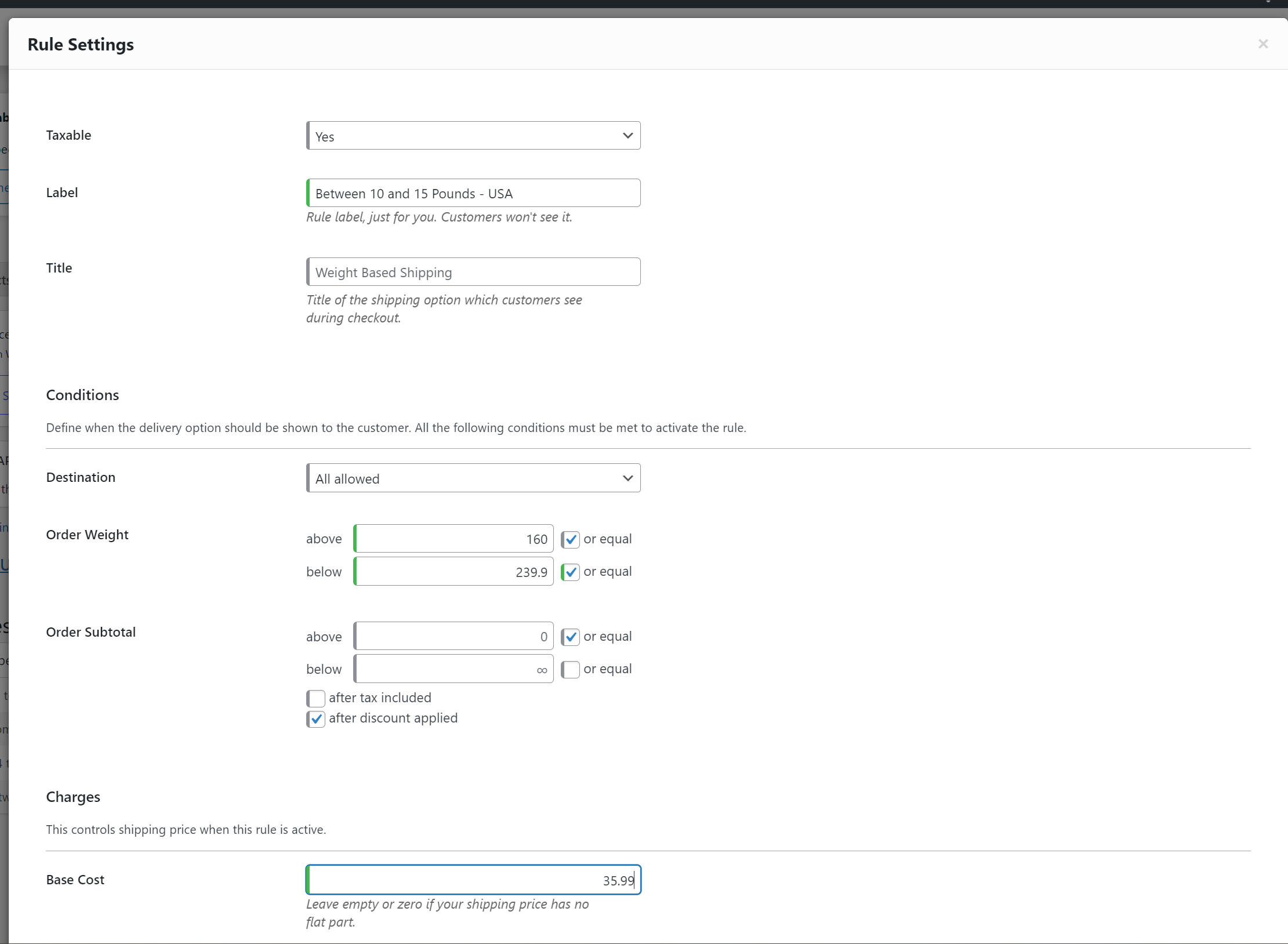 Speaking of which, here is how I would built out that weight tier for the USA shipping zone - a weight greater than or equal to 10 lbs on the nose to just under 15 lbs) and if you check the US rate chart that amount is $35.99 (shipping rates will change over time):