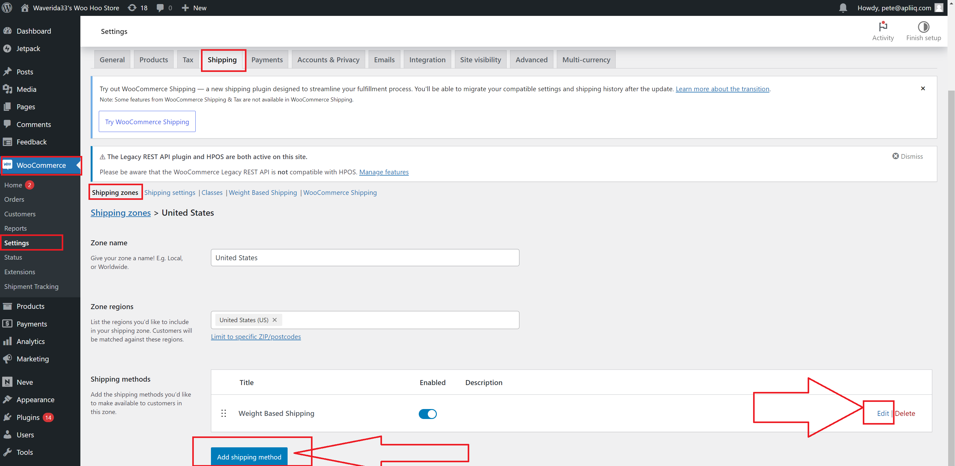 Now, I've already clicked the "add shipping method" button and have selected Weight-Based Shipping so I am going to click on the 'edit' button to edit the rules and conditions for the USA shipping zone, but the sequence of moves does matter here: