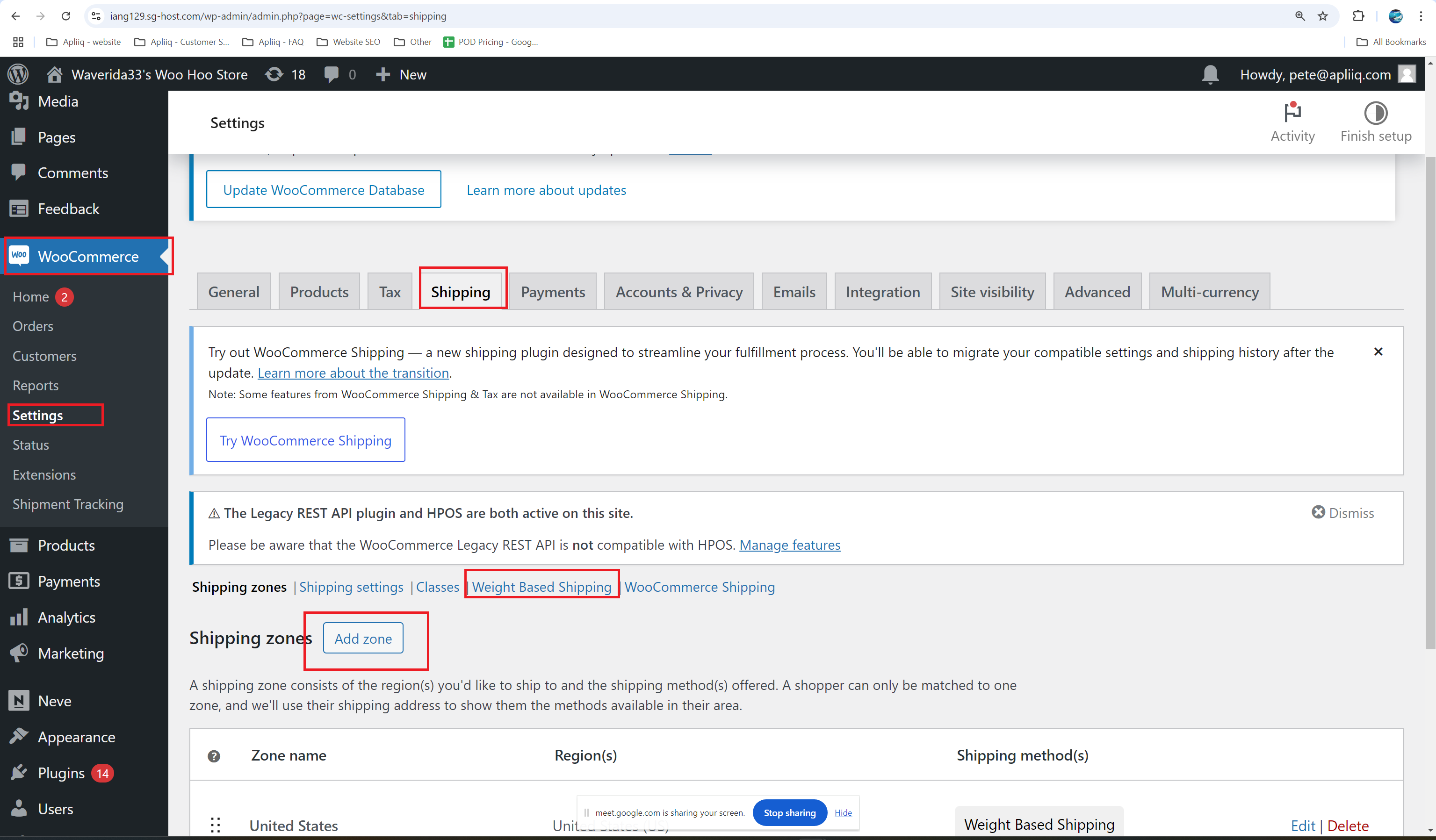 The process for building out shipping rates in Woo starts with the shipping zone and then you declare the type of shipping method to be applied (which is why you must download and install the Weight-Based shipping plugin first in order to have that option to select when building out your shipping profile).