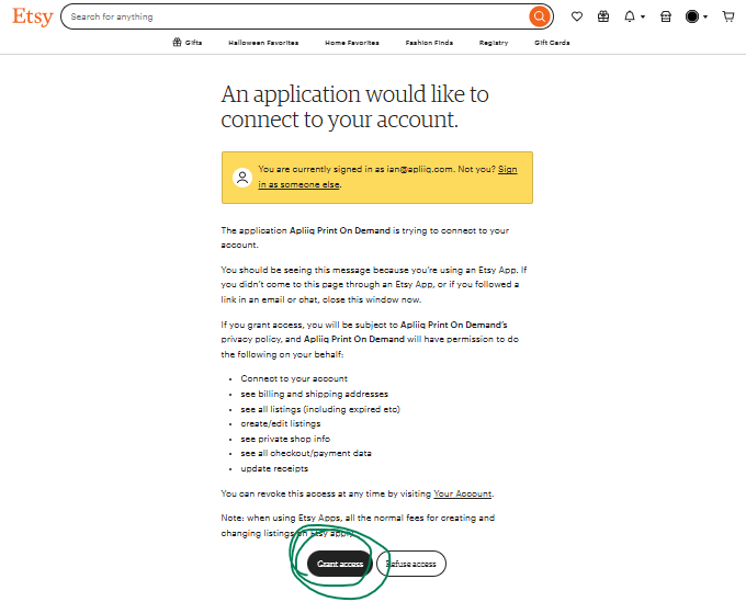 3. Once you are logged in, you must grant the Apliiq app access to your Etsy Store: