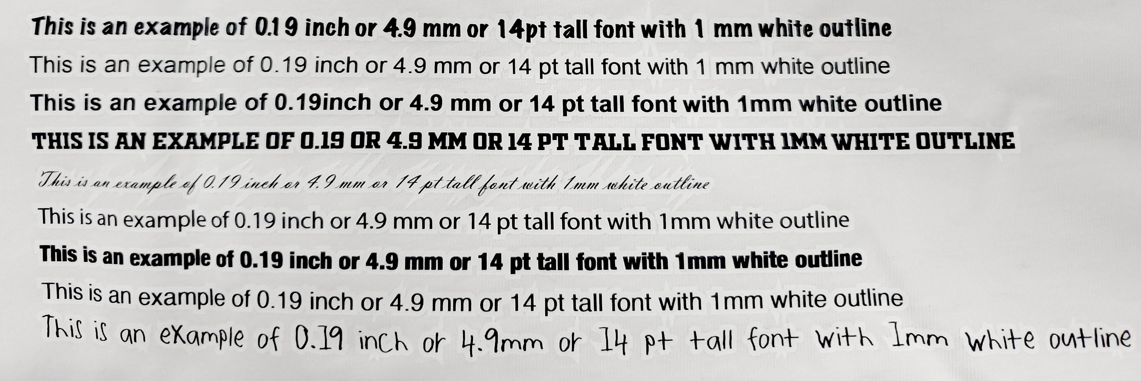 * If fonts are less than 2mm, we recommend adding a stroke or outline to the font to make it thicker (you can add a similar color to the garment itself or a contrasting color)
