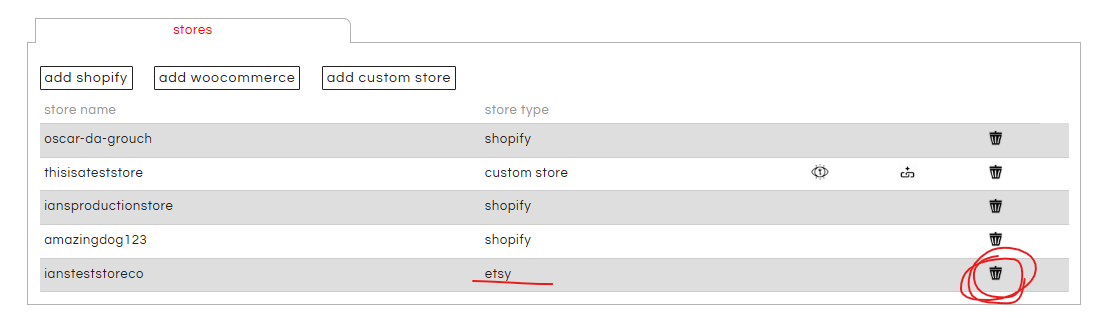 Removing the Apliiq X Etsy app is simple and only take a moment. Navigate to your stores page, and click the delete icon next to your Etsy store.